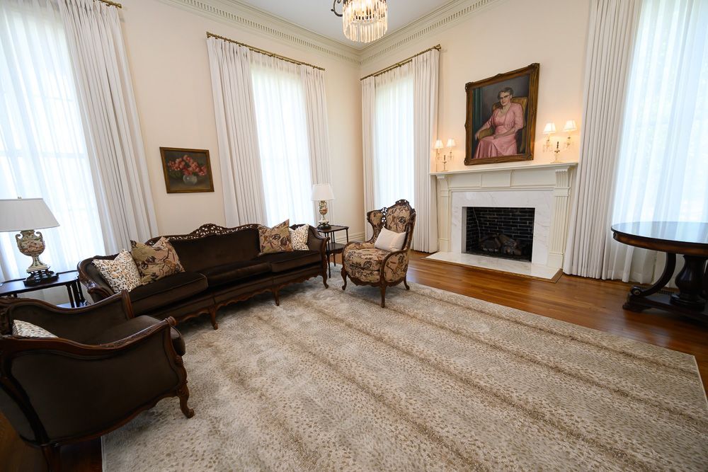 The dining room houses a large cherry wood table that will seat up to 12. The 2 parlors featuring paintings of T.L & Maggie James have comfortable seating for lounging & conversation. A large screen TV is located in the Blue Parlor. The kitchen offers lots of prep space with 2 stainless steel work tables, extra large sink, French door refrigerator, 8-range stove, microwave, and commercial ice maker. Two powder rooms are located on this floor which is also handicap-accessible. You can serve about 100 people seated/175 standing on the Main Floor and Sunroom.
